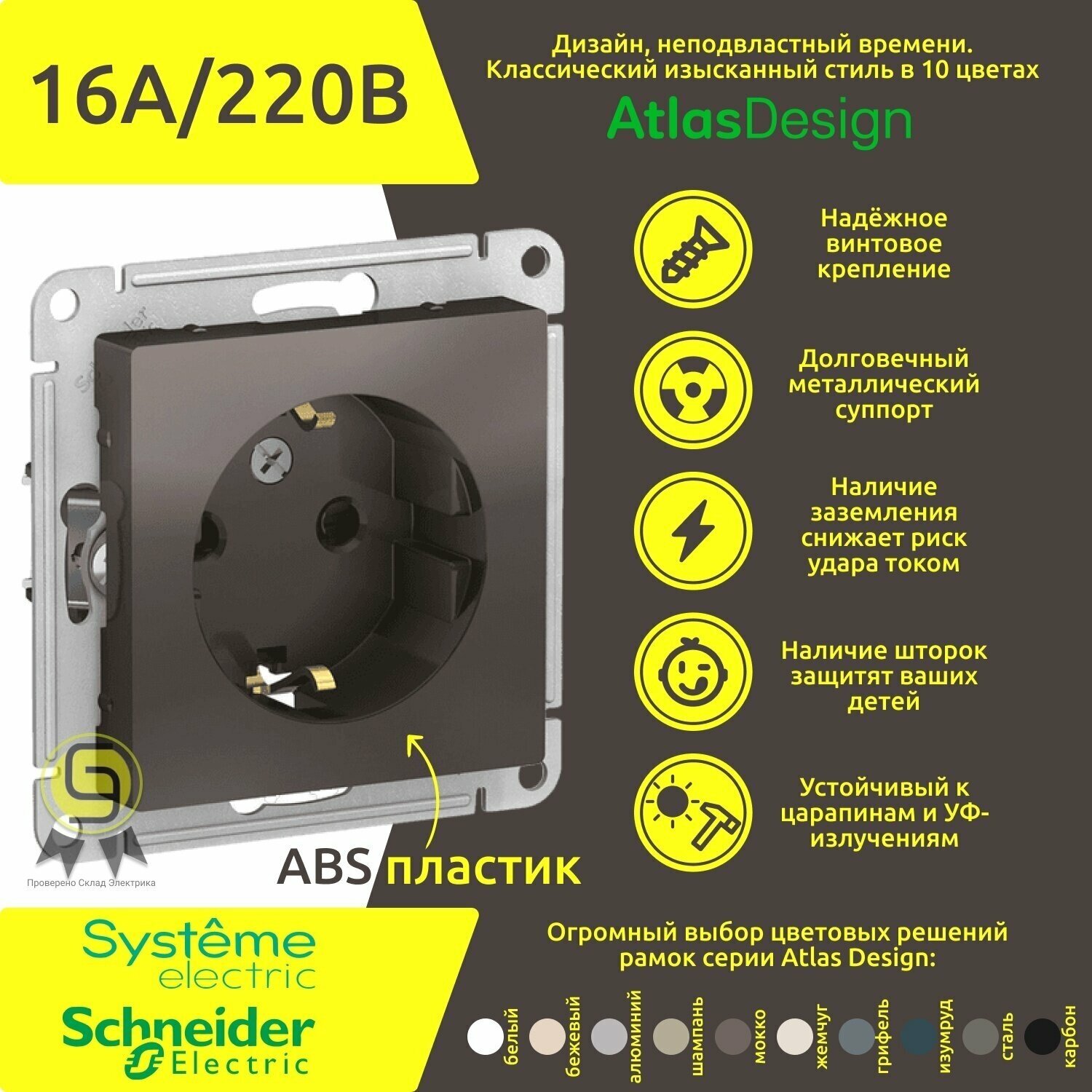 Отзывы на Механизм розетки с заземлением и защитными шторками Schneider Electric AtlasDesign, 16A, Мокко (комплект 3шт)
