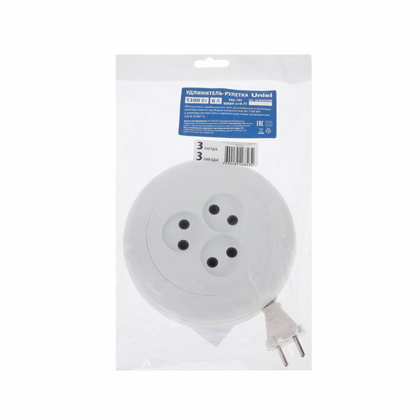Uniel Удлинитель-рулетка Uniel, 3 розетки, 3 м, 6 А, 1300 Вт, ШВВП 2х0.75 мм2, без з/к, белый