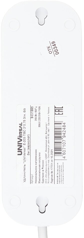 Удлинитель UNIVersal 3 розетки 5 м ПВС 2х0,75 кв.мм 10 А 2,3 кВт белый (9631965) информация: