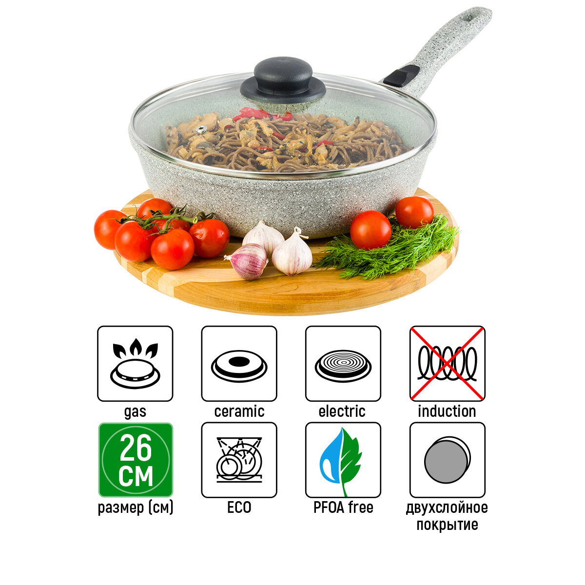 Сковорода глубокая 26 см Elan Gallery гармония вкуса Серый мрамор индукция с крышкой D26, с несъёмной ручкой