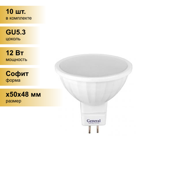 Лампочка светодиодная, General, Комплект из 10 шт., 12 Вт, Цоколь GU5.3, 3000К, Форма лампы Круг, MR16 1 176 ₽