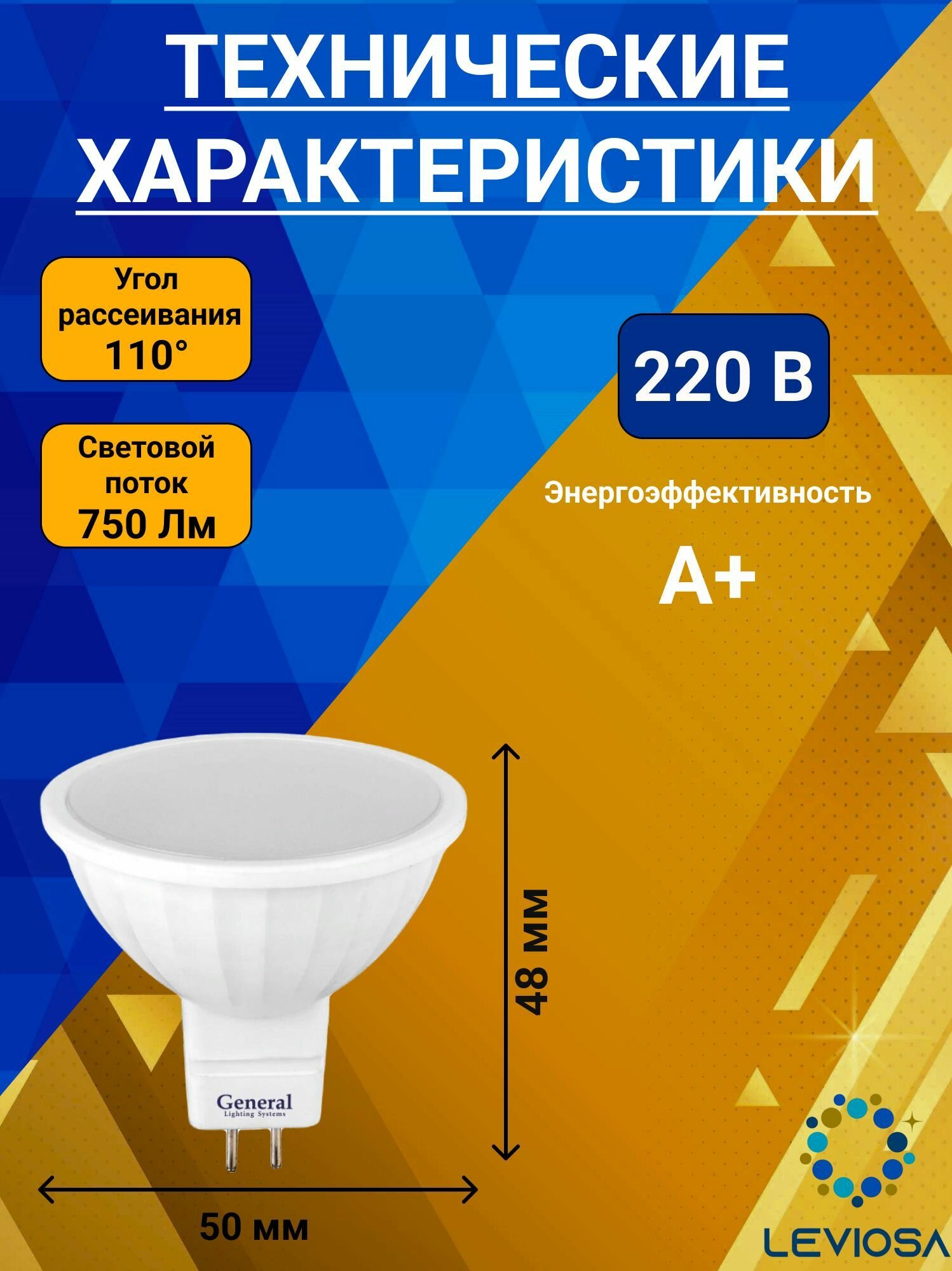 (20 шт.) Светодиодная лампочка General MR16 GU5.3 10W 6500K 6K 49,5x51 пластик/алюм 686400 Холодный белый. Цоколь GU5.3 3 419 ₽