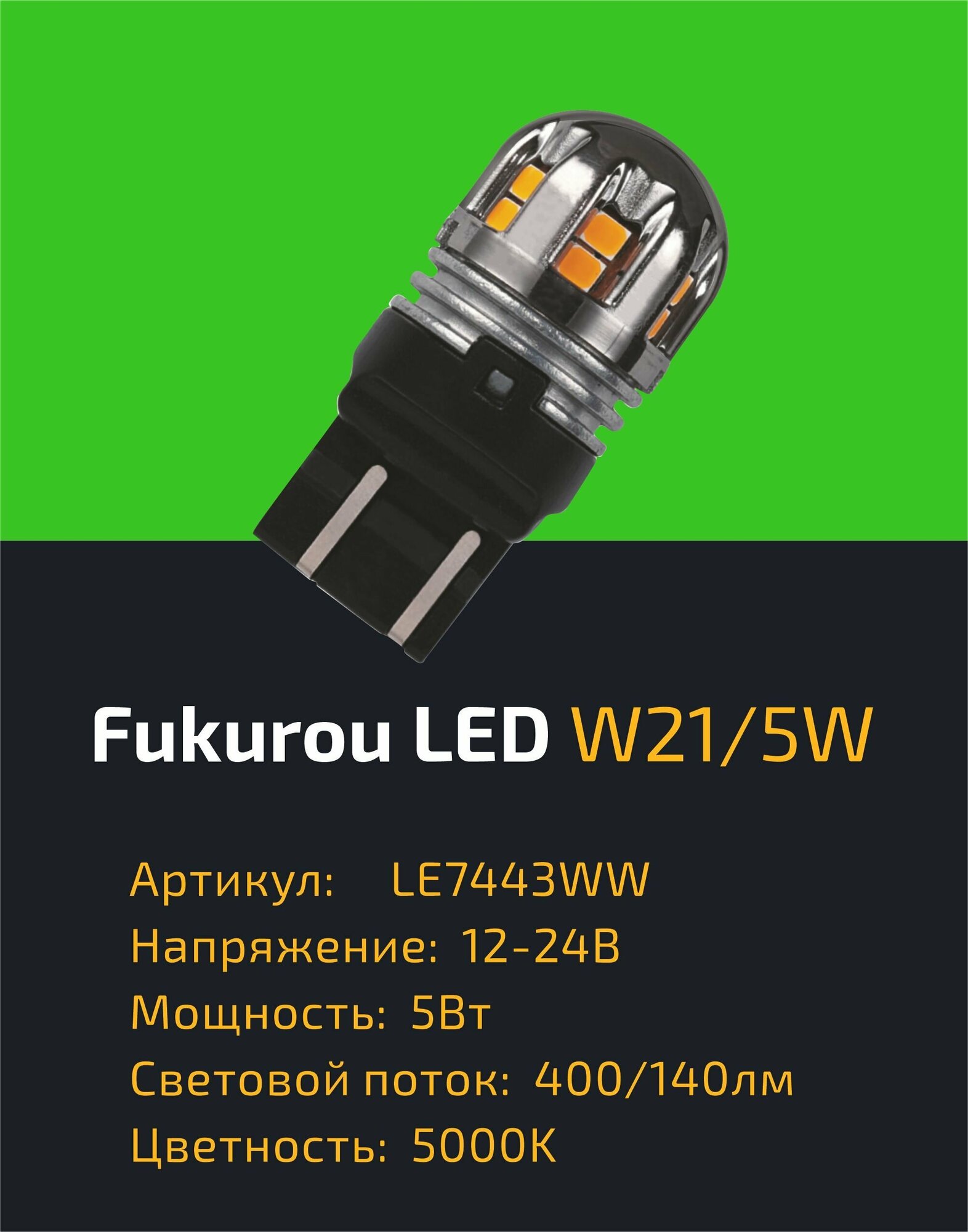 Лампа светодиодная сигнальная W21/5W W3x16q 5000K LED 12V 5W Коробка 2шт LE7443WW FUKUROU LE7443WW | цена за 1 шт | минимальный заказ 1