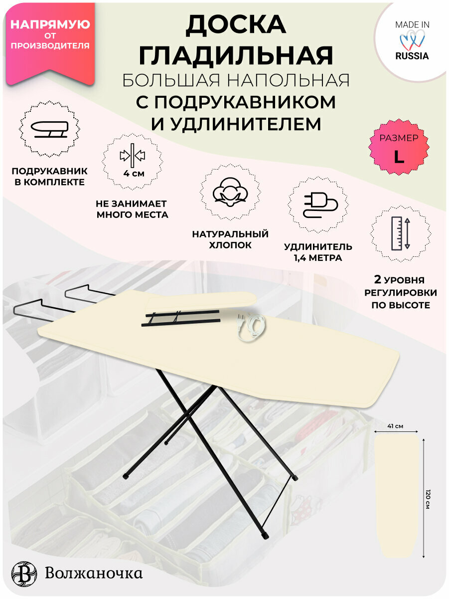 Отзывы на Волжаночка Гладильная доска напольная большая с подрукавником, подставкой для утюга, розеткой и удлинителем, размер 120х41 см., цвет светло-бежевый