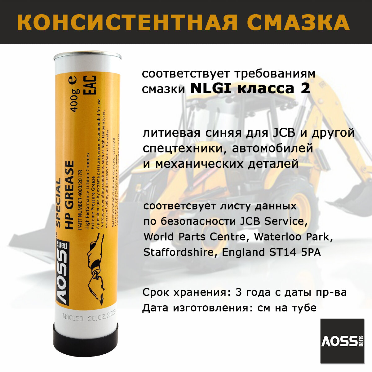 Смазка литиевая синяя высокотемпературная туба 400г AOSS Parts Special HP GREASE водостойкая для спецтехники JCB 3CX, автомобильная, для подшипников информация: