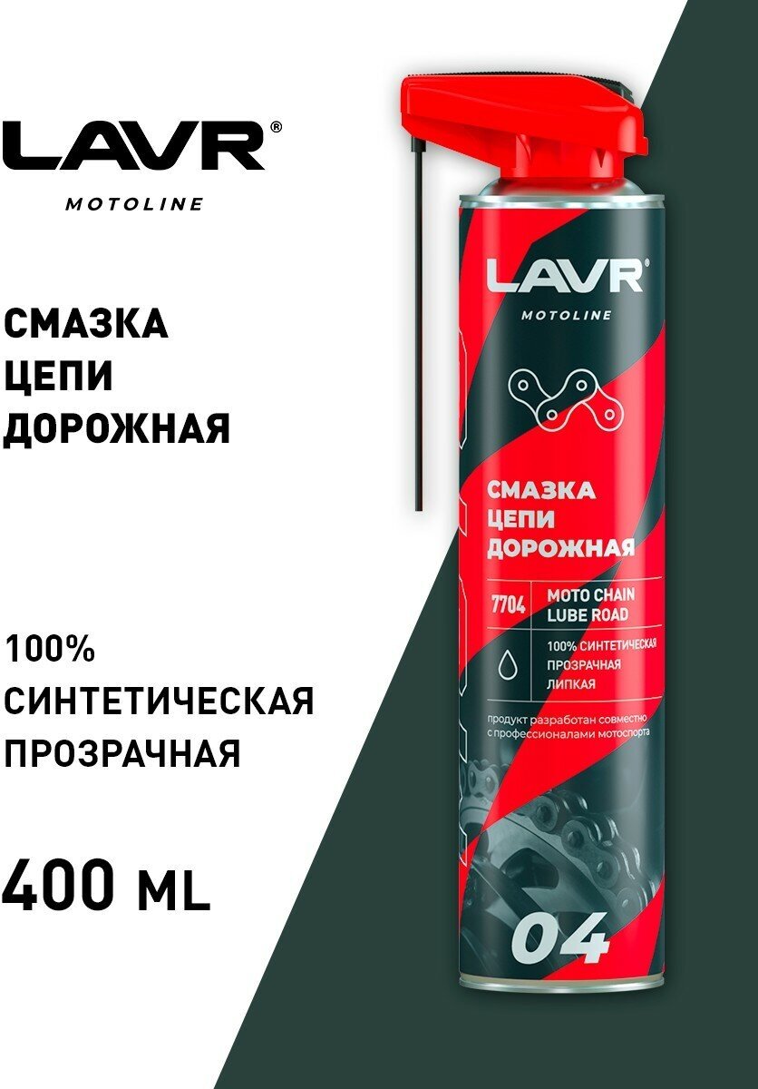 | Способ применения | Перед обработкой цепь очистить от следов старой смазки и грязи с помощью Очистителя цепи Ln7701. Тщательно встряхнуть баллон перед использовани-ем. 1. Нанести средство тонким слоем на внутреннюю часть цепи, медленно поворачивая колесо для мак-симального проникновения. 2. Дать средству высохнуть в течение 10 — 15 минут, после чего защитные свойства достигнут максиму-Горячая линия 8-800-100-67-65(звонок по России бесплатный)www.lavr.ru03/2022ма. На поверхности останется прозрачная пленка. 3. Удалить излишки смазки ветошью. Для достижения наилучшего результата использо-вать при температуре баллона выше +14°C. Избегать попадания смазки на тормозные механизмы |