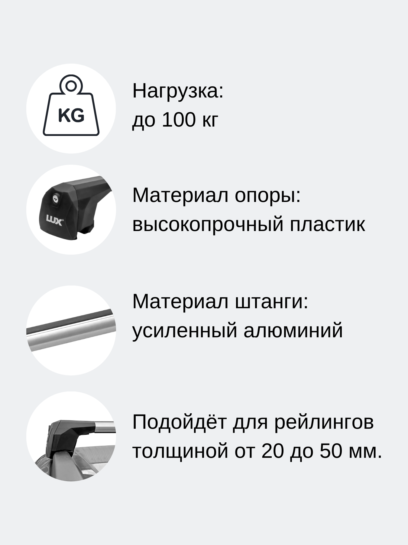 | Подробная комплектация | поперечины - 2 шт., опоры с замками и ключами - 4 шт., резинки для закрытия т-паза - 2 шт.,ключ для установки - 1 шт., инструкция |