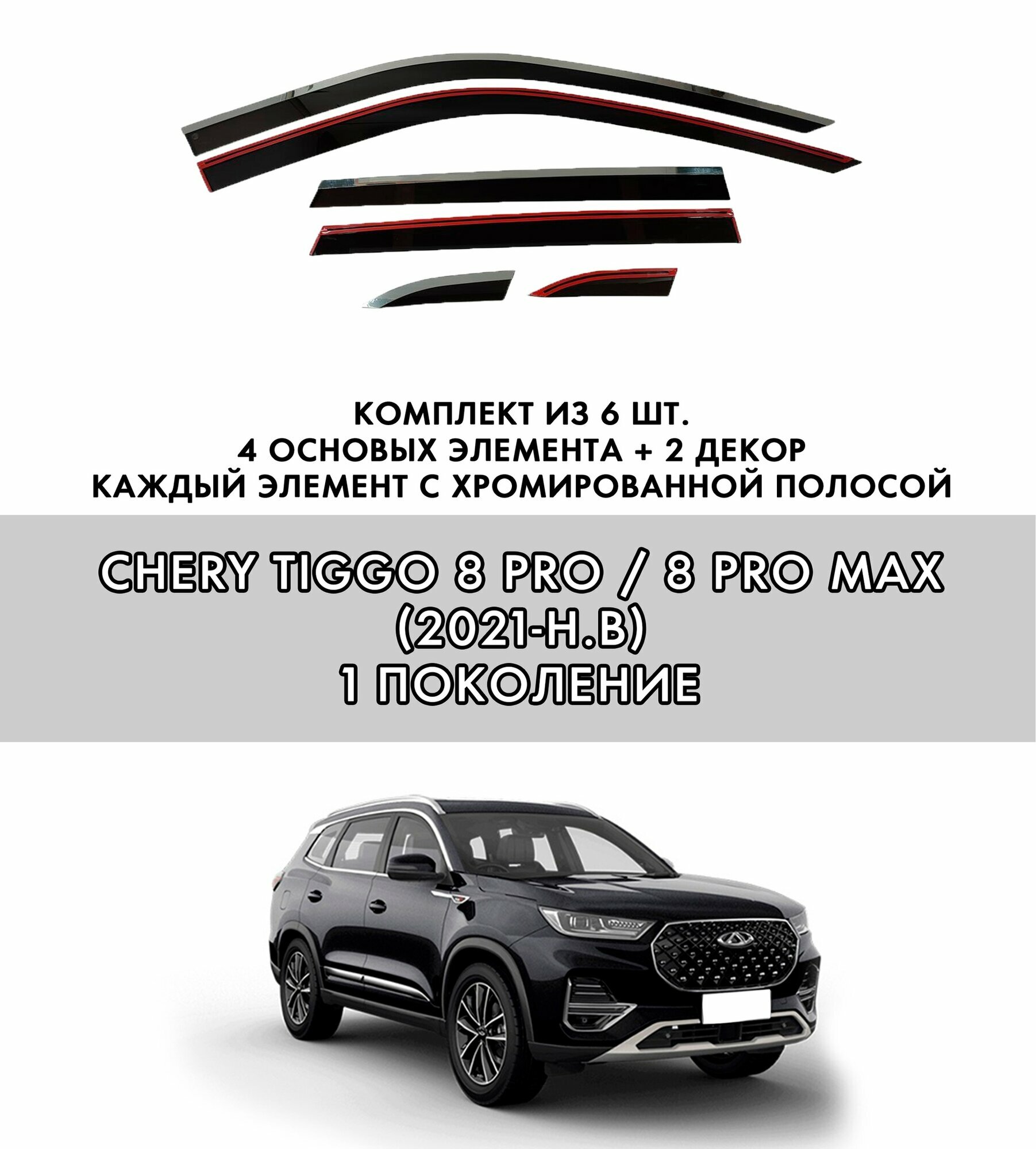 2D дефлекторы с хромом для окон Chery Tiggo 8 PRO (подходит на 8 PRO Max) (2021-н.в) Ветровики на Чери Тиго 8 про. Комплект 6 шт. информация: