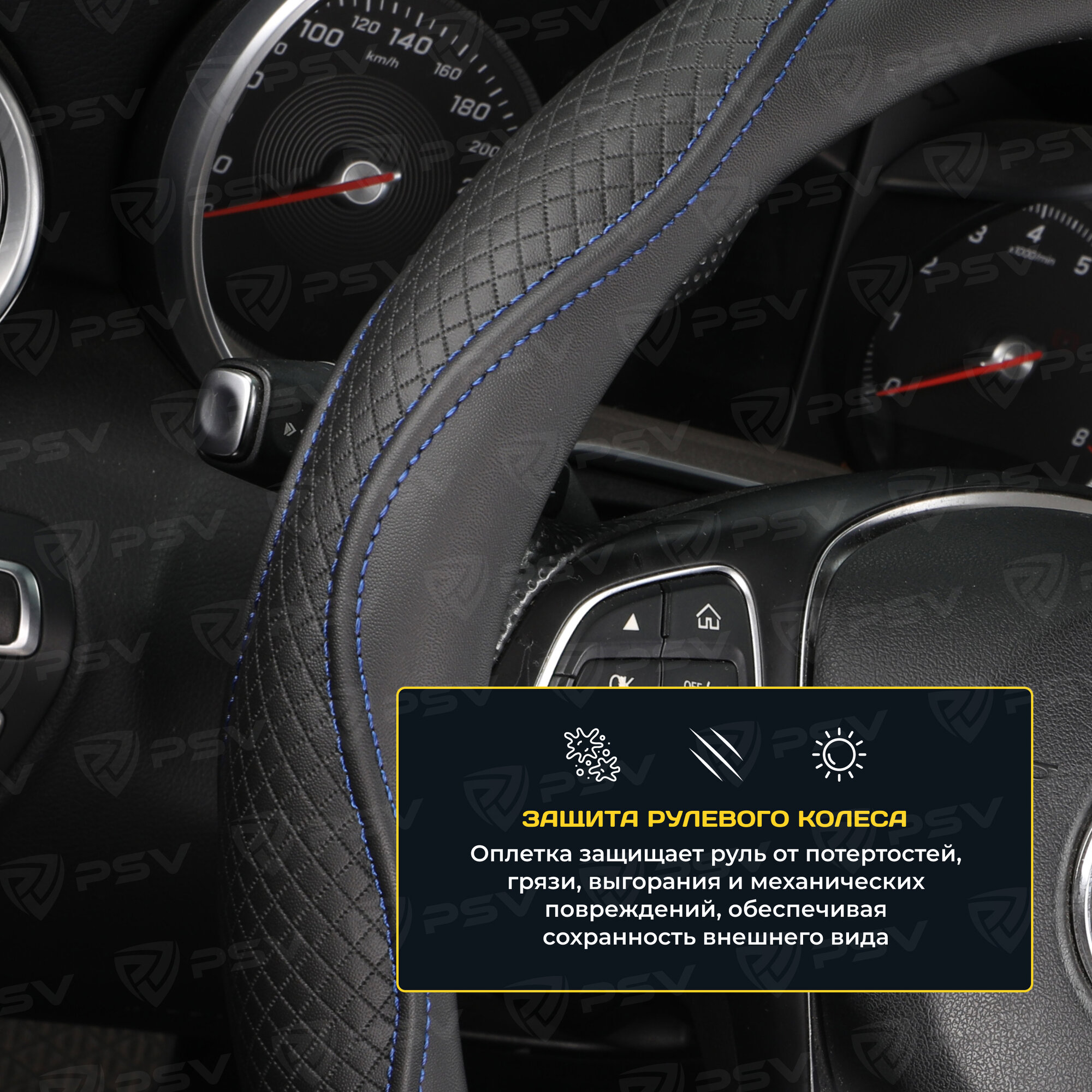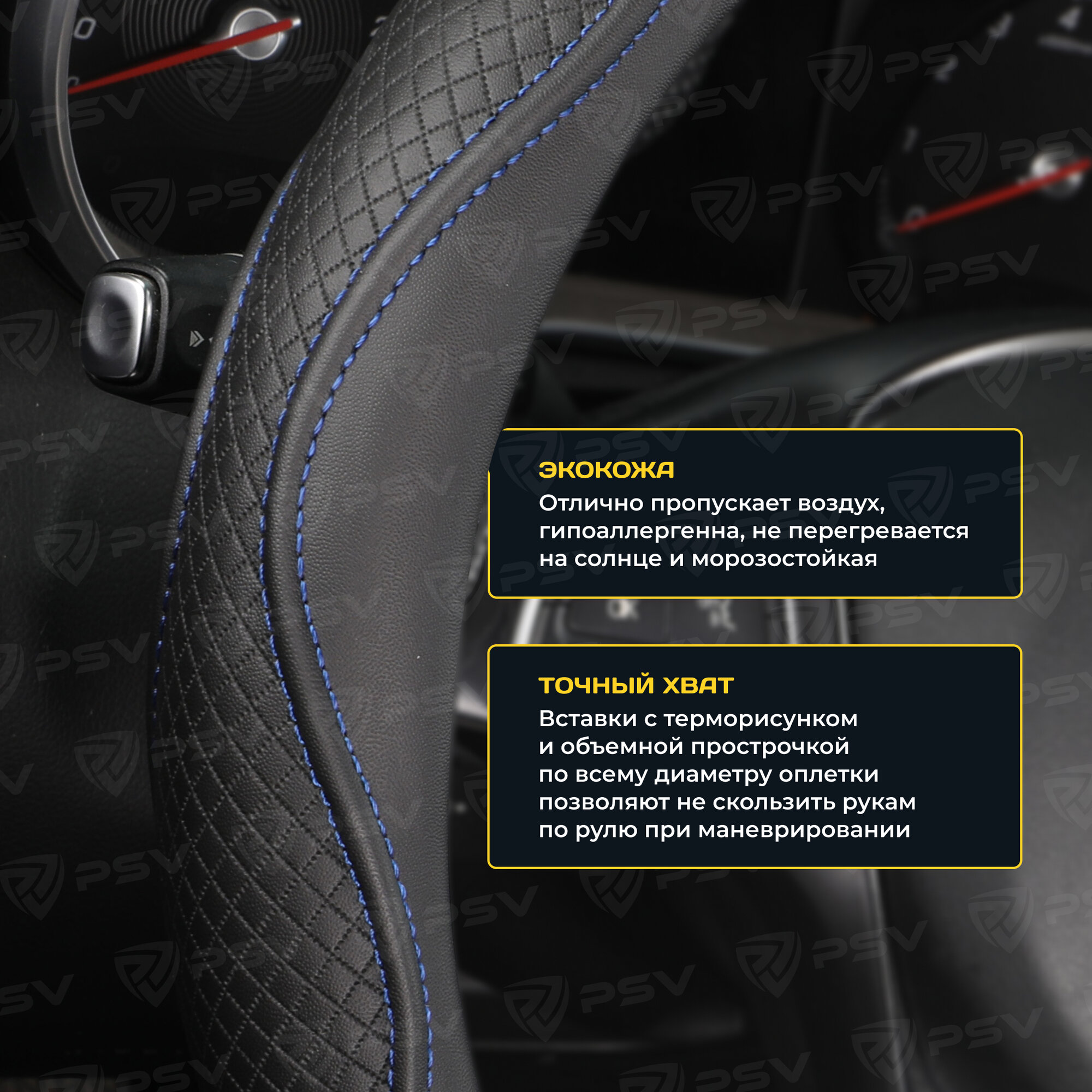 10 цен на Оплетка чехол на руль PSV ILLUSION (Черный/Отстрочка синяя) M 37-39 см, экокожа, 136846