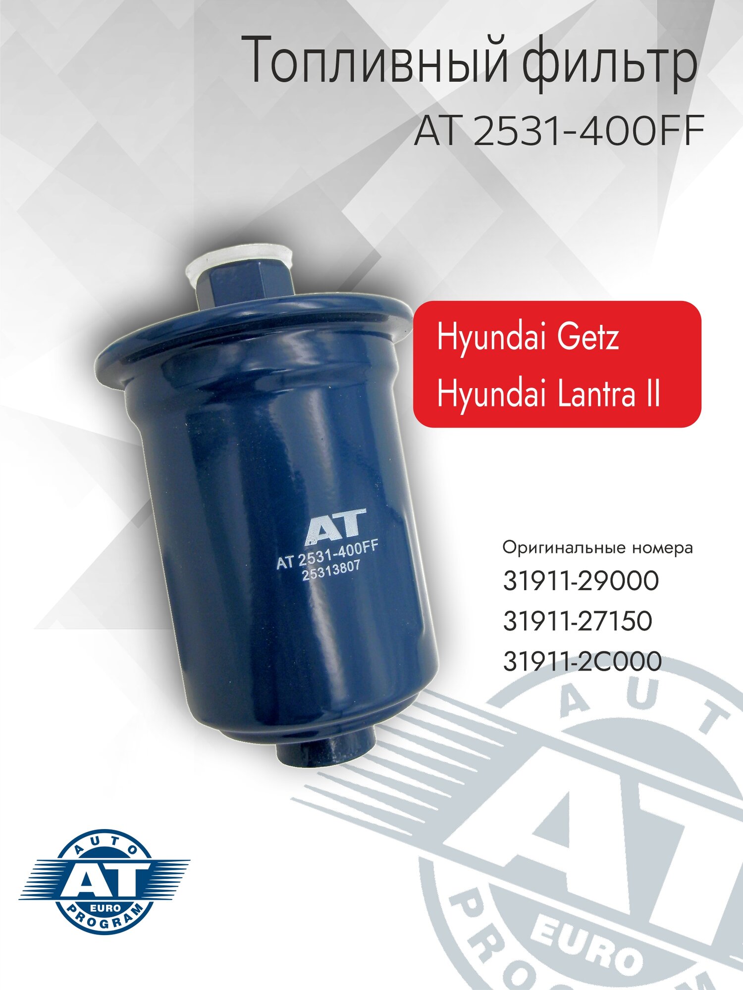 Фильтр топливный AT арт. AT 2531-400FF, HYUNDAI GETZ 02-, COUPE 96-, LANTRA II 95-00 1.1/1.3/1.4/1.5/1.6 информация: