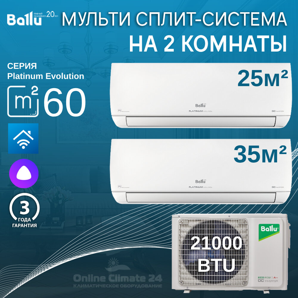Инверторная мульти сплит-система BALLU на 2 комнаты (25 м2 + 35 м2) BA2OI-FM/out-21HN8/EU+BSUI-FM/in-09HN8/EU+BSUI-FM/in-12HN8/EU, белый информация: