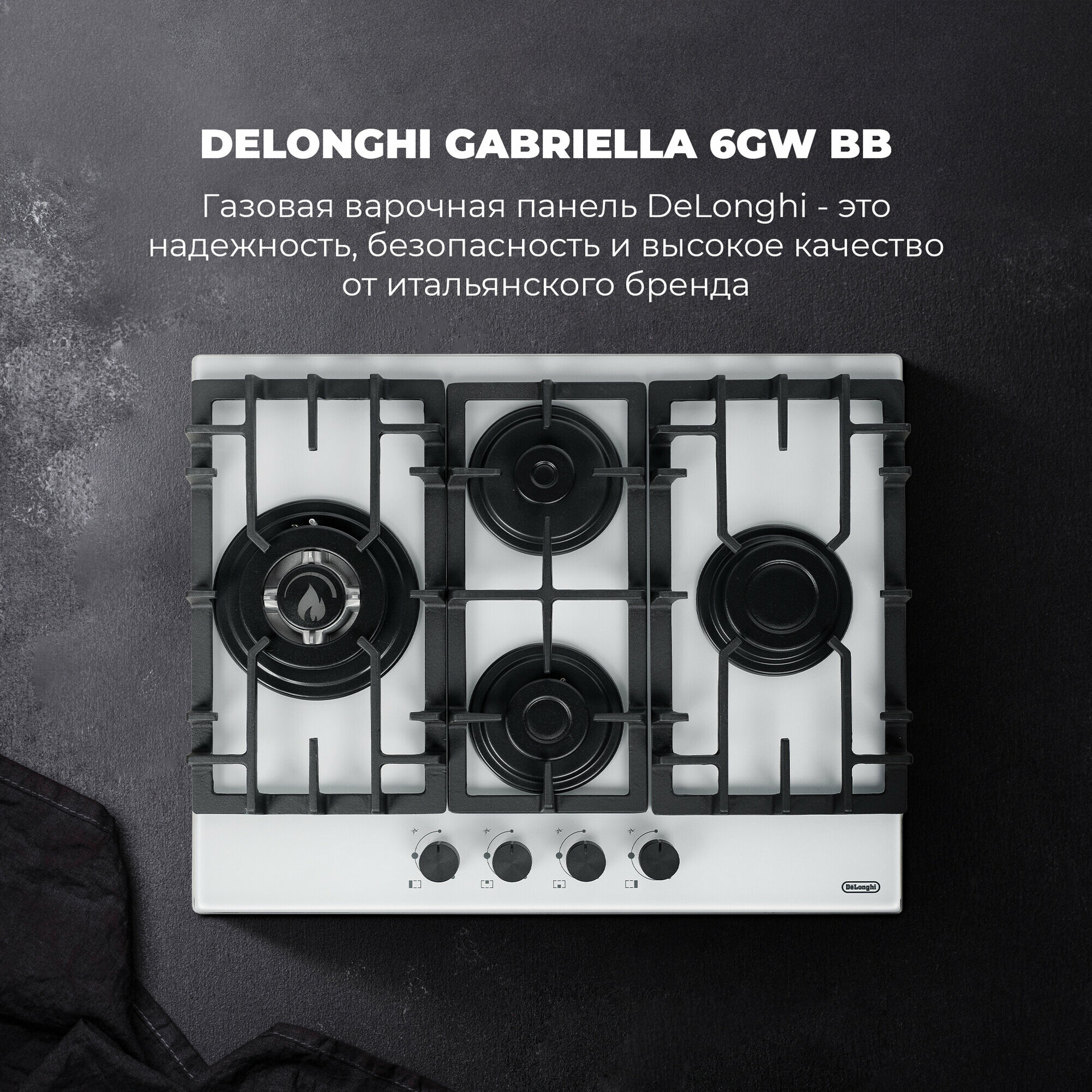 Газовая варочная панель DeLonghi GABRIELLA 6GW BB, 64 см, белая, WOK-конфорка, чугунные решетки, автоматический розжиг, газ-контроль