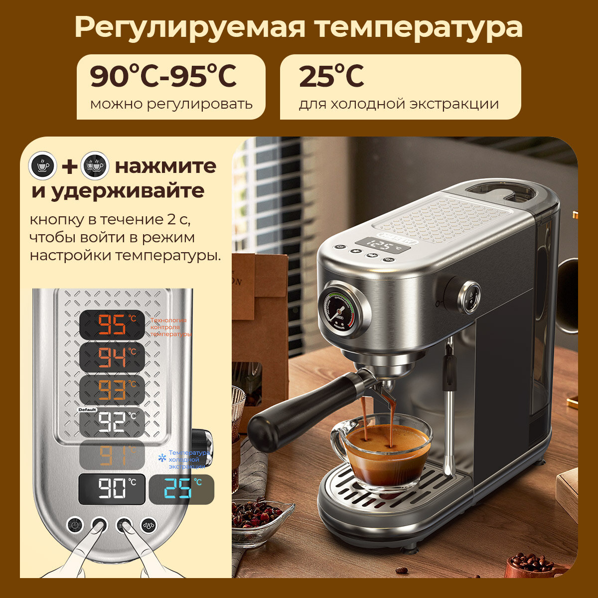 | Настройки | крепость кофе / температура кофе |