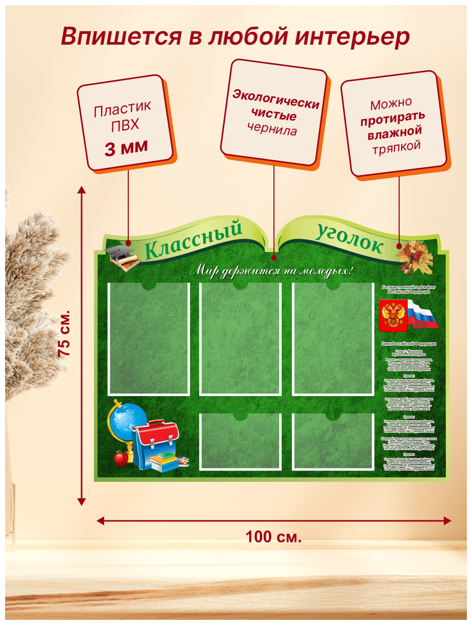 Отзывы на Стенд "Классный уголок с символикой", 1000х750 мм, 3 плоских кармана А4, 2 плоских кармана А5