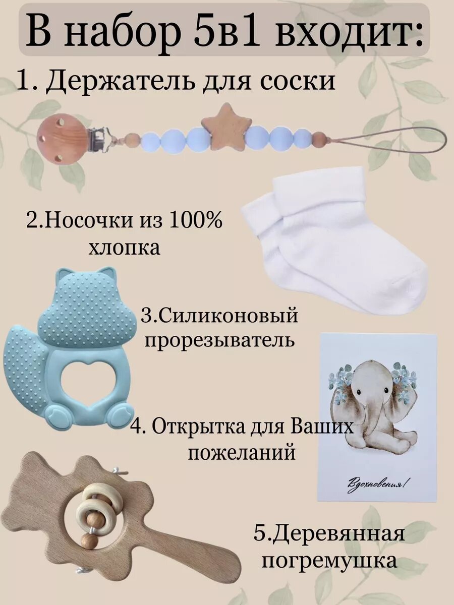 | Комплектация | Держатель для пустышки,, силиконовый прорезыватель, деревяная погремушка, носки, открытка |
