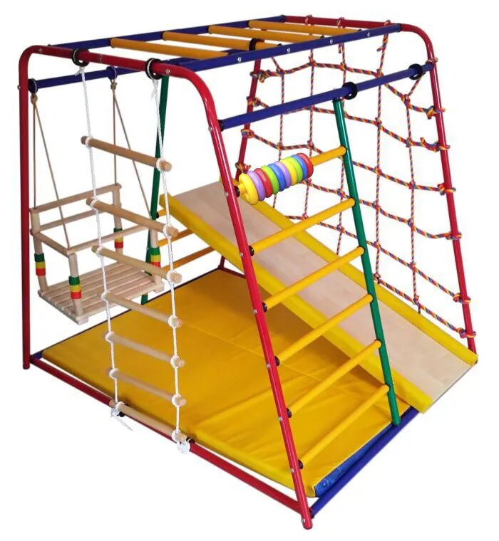 | Комплектация | металлический каркас гимнастический мат складной 0,95 х 1,25 х 0,04 м. (+/- 1 см.) детские веревочные качели кольца гимнастические веревочная лестница 6 ступеней трапеция диск-тарзанка сетка - паутинка горка с мягкими бортиками |