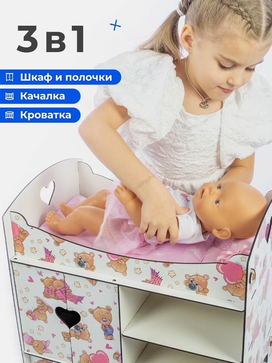 Отзывы на Кроватка для кукол до 45 см "Мишки" со шкафом и полками, 2-х сторонняя