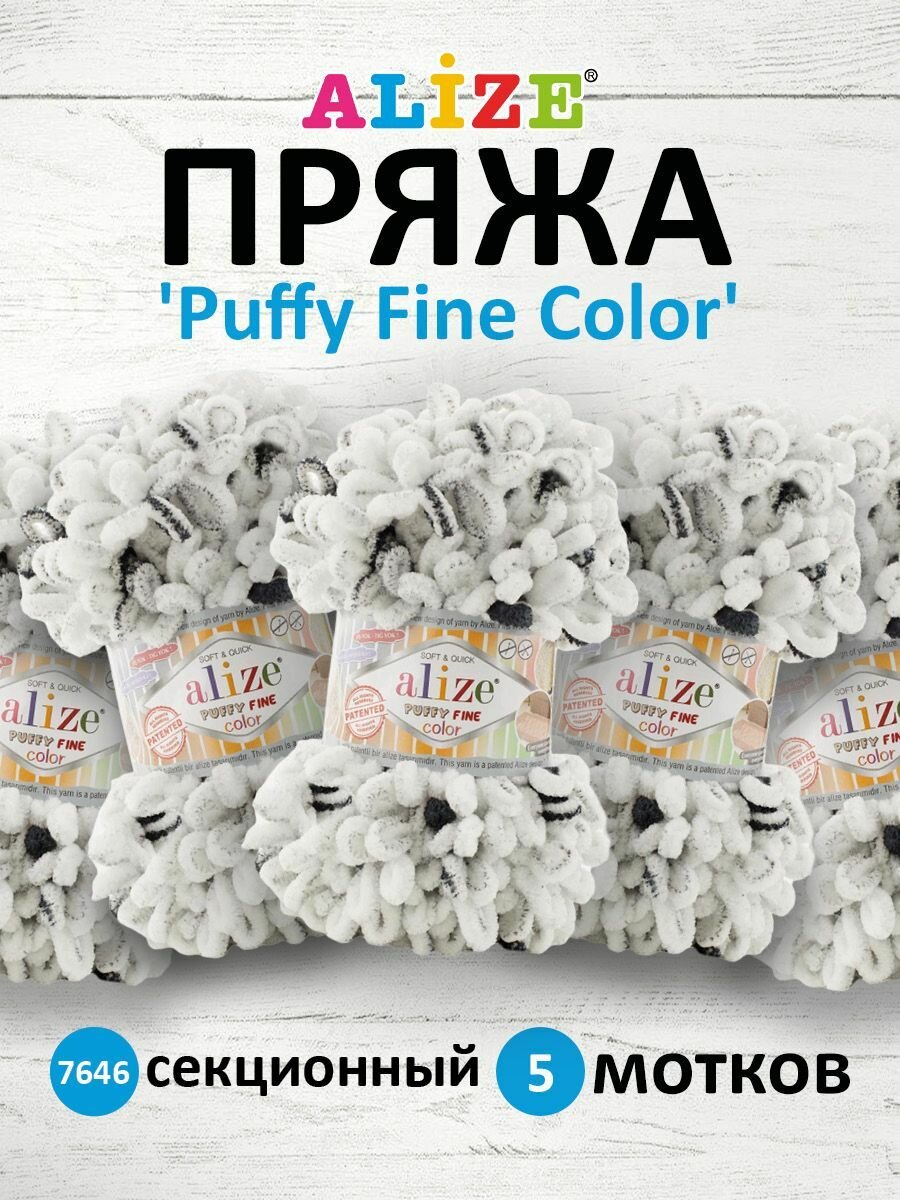10 цен на Пряжа Alize Puffy fine color белый-черный (7646), 100%микрополиэстер, 14.5м, 100г, 5шт
