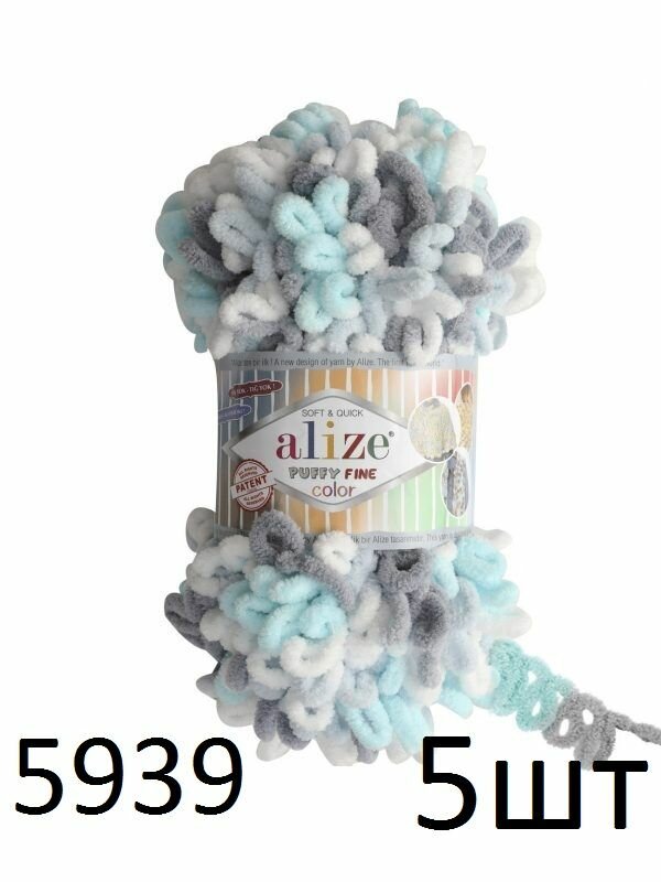 10 цен на Пряжа Alize Puffy Fine Color -5 шт, Бело-бирюзовый (5939), 14 м/100 г, маленькие петли (2 см) /Ализе Пуффи Файн/