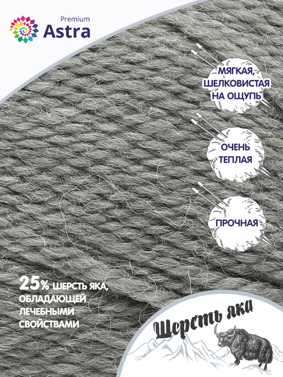 Пряжа для вязания Astra Premium 'Шерсть яка' (Yak wool) 100гр 120м (+/-5%) (25% шерсть яка, 50% шерсть, 25% фибра) (13 серый), 2 мотка информация: