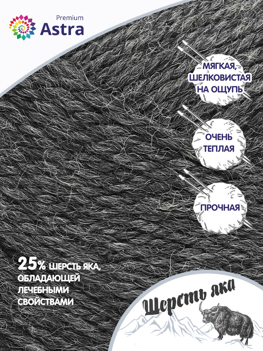 Пряжа для вязания Astra Premium 'Шерсть яка' (Yak wool), 100 г, 120 м (+/-5%) (25% шерсть яка, 50% шерсть, 25% фибра) (14 графит), 2 мотка информация: