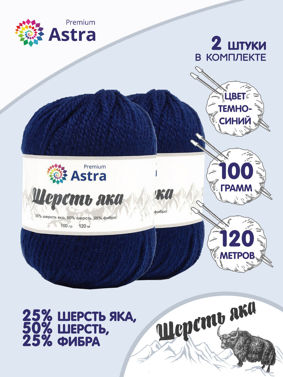 Отзывы на Пряжа для вязания Astra Premium 'Шерсть яка' (Yak wool), 100 г, 120 м (+/-5%) (25% шерсть яка, 50% шерсть, 25% фибра) (16 темно-синий), 2 мотка