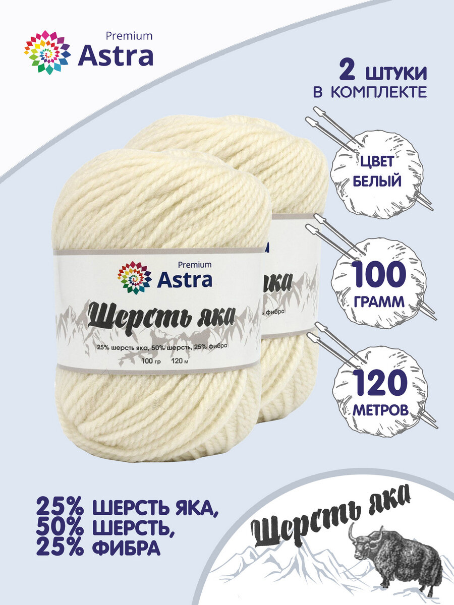 Пряжа для вязания Astra Premium 'Шерсть яка' (Yak wool), 100 г, 120 м (+/-5%) (25% шерсть яка, 50% шерсть, 25% фибра) (06 молочный), 2 мотка 892 ₽