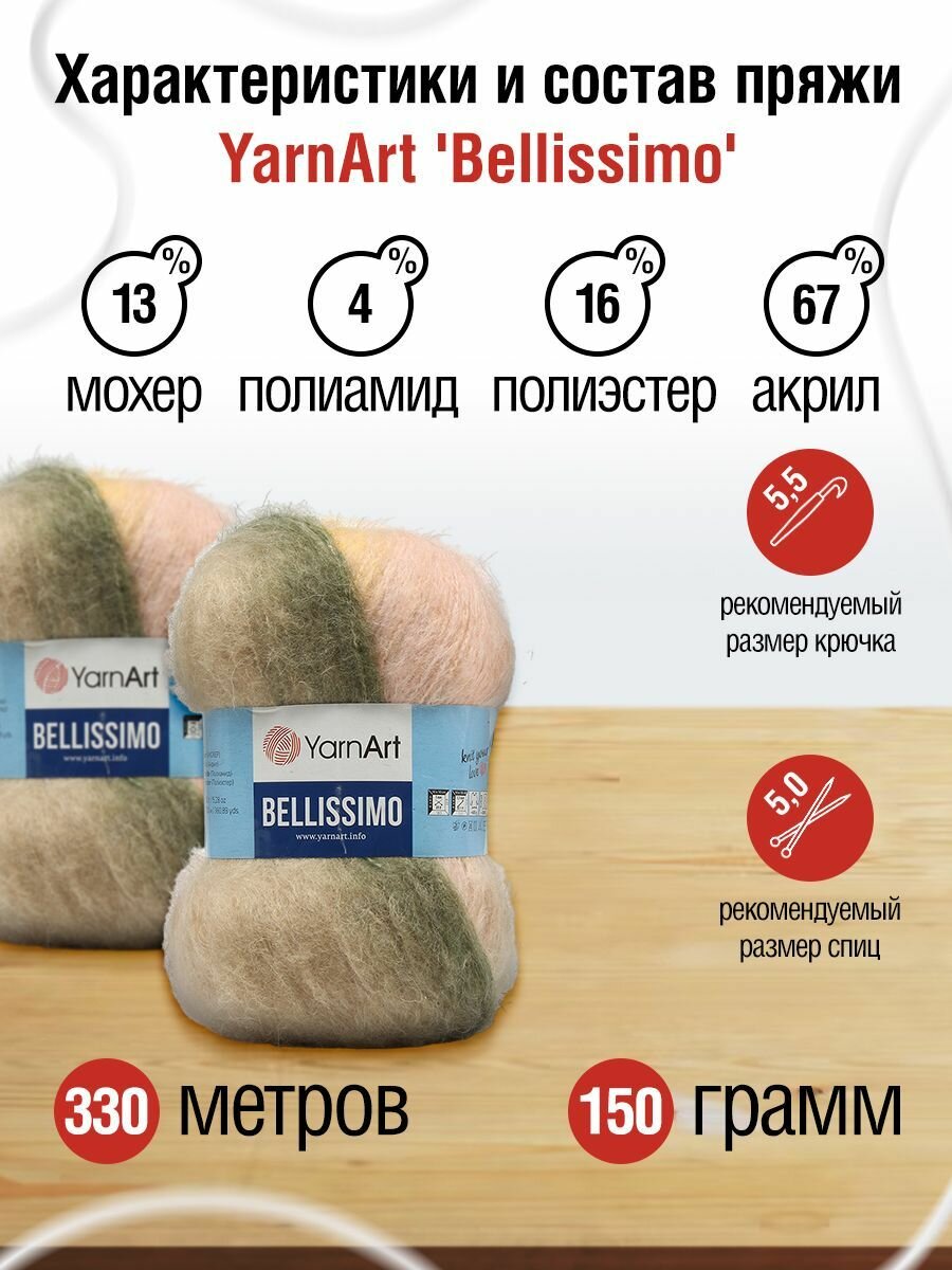 Пряжа для вязания YarnArt 'Bellissimo', 150г, 330м (13% мохер, 67% акрил, 4% полиамид, 16% полиэстер) (1410), 3 мотка информация: