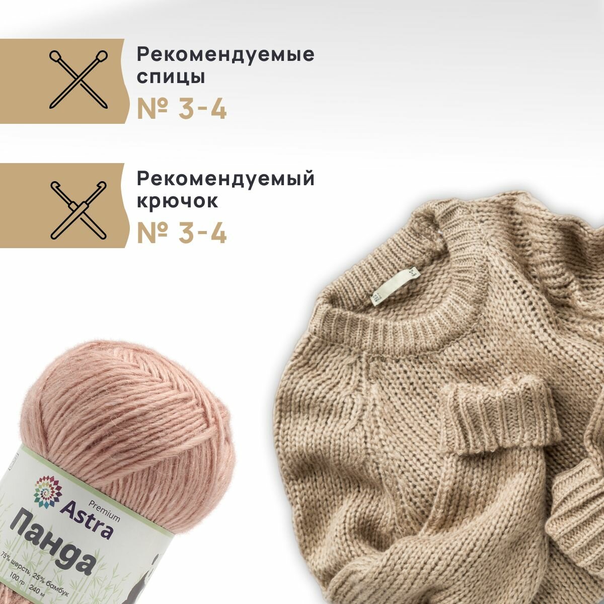 Пряжа для вязания Astra Premium 'Панда' (Panda), 100 г, 240 м (75% шерсть, 25% бамбук), 2 мотка