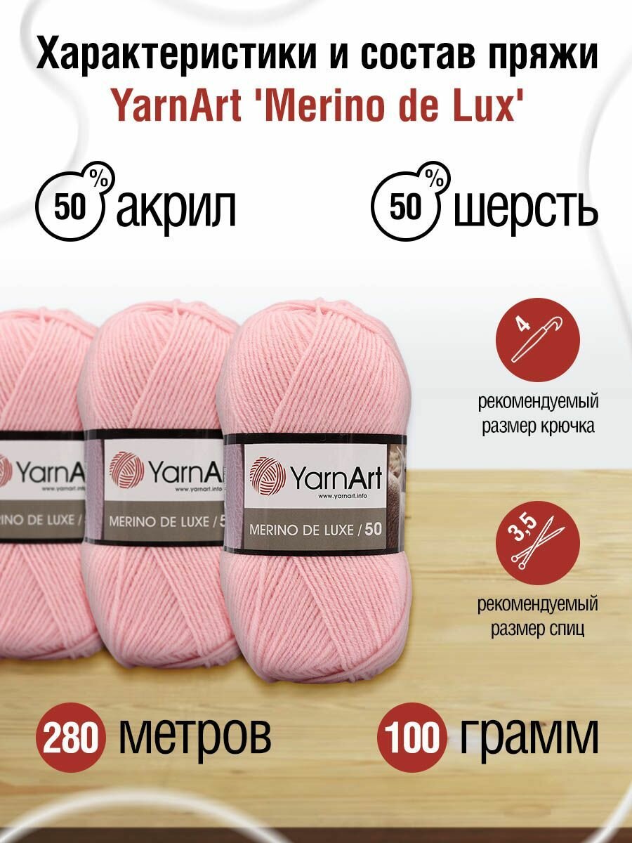 Пряжа для вязания YarnArt 'Merino de Lux', 100г, 280м (50% шерсть, 50% акрил) (217 розовый), 5 мотков информация: