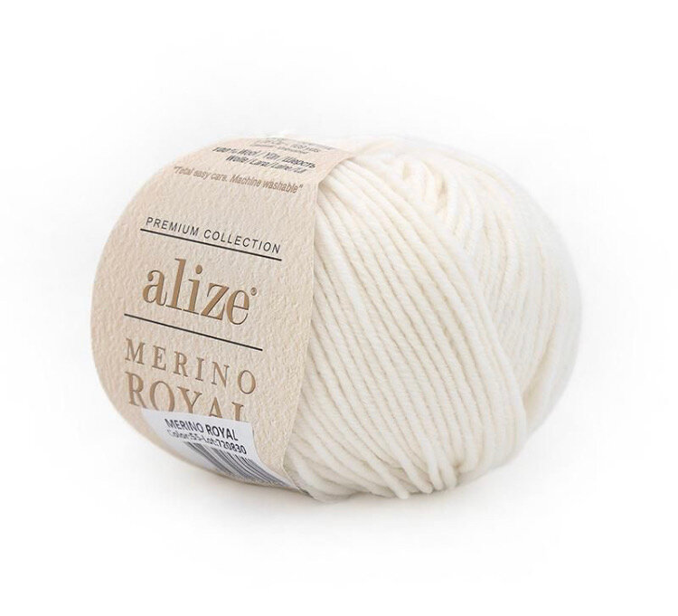 Мериносовая пряжа для вязания Alize Merino Royal, цвет 62 молочный, моток 50г, 100м, 10 мотков/упак