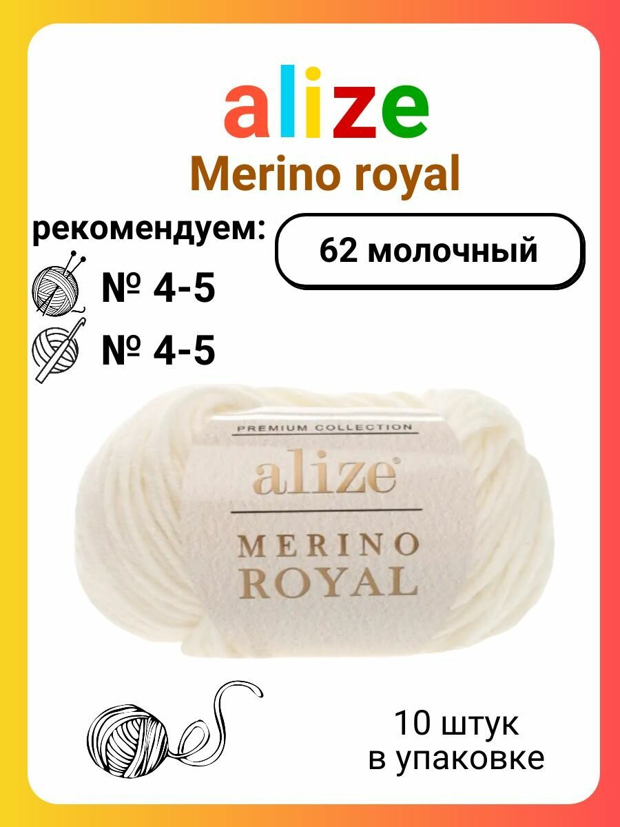 Пряжа для вязания Alize Merino royal (62) молочный, 50 г, 100 м, 10 штук информация: