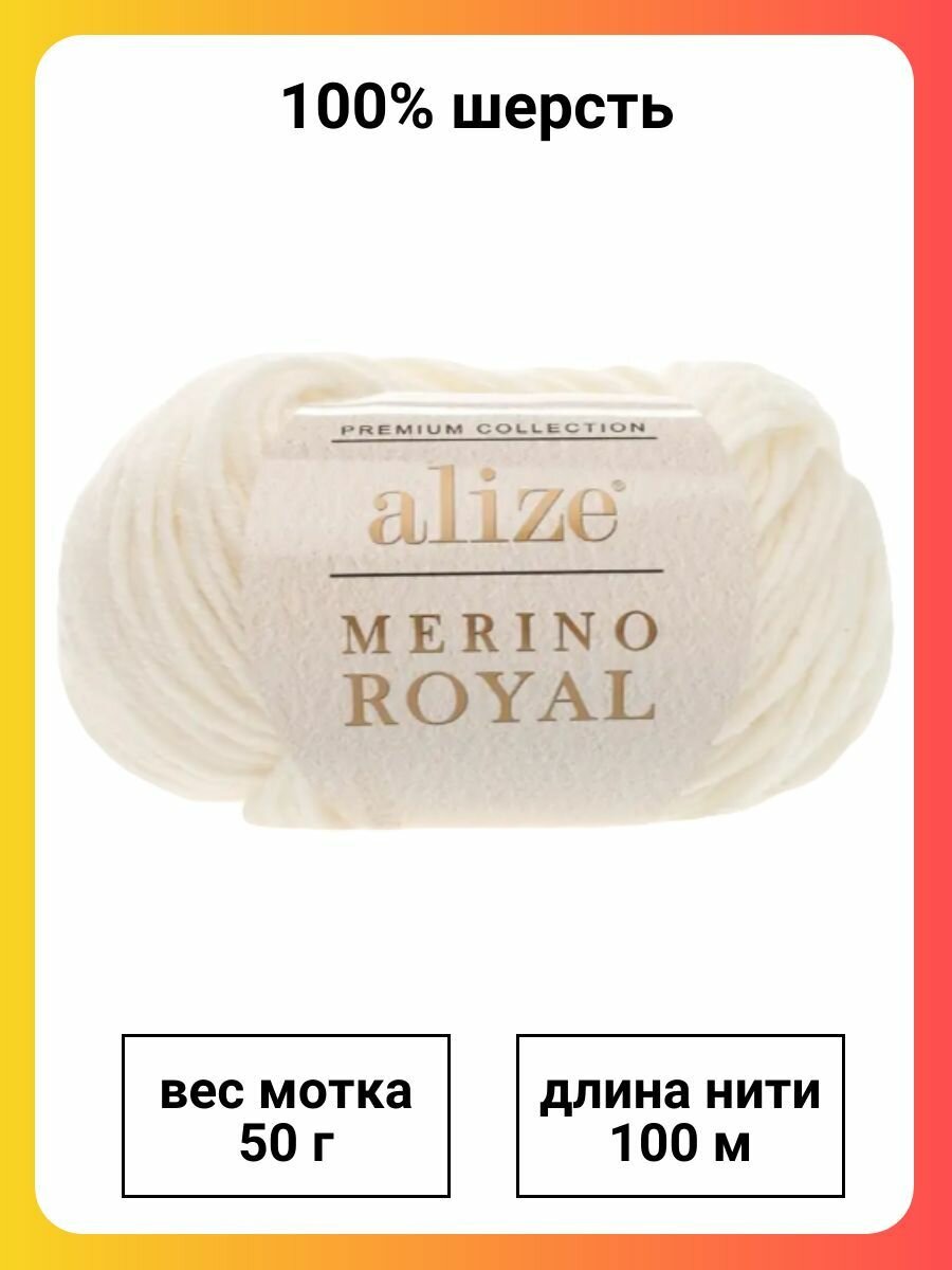 Пряжа Alize Merino Royal, 62 молочный, 50 г, 100 м, 100 % шерсть, 1 шт 429 ₽