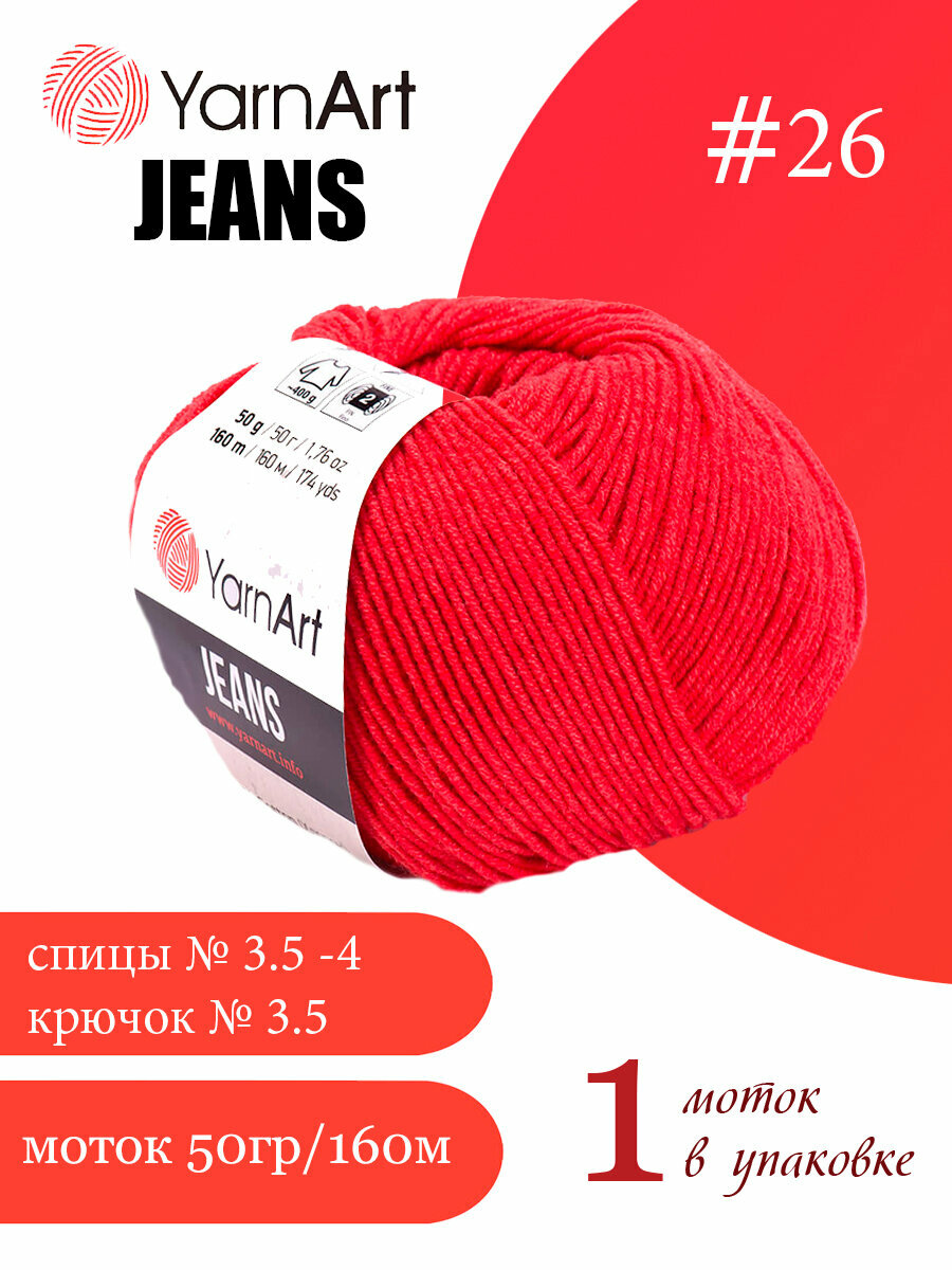 Пряжа YarnArt Jeans Ярнарт Джинс, 26 ярко красный, 55 % хлопок, 45 % акрил, 50 г, 160 м, 1 моток. информация: