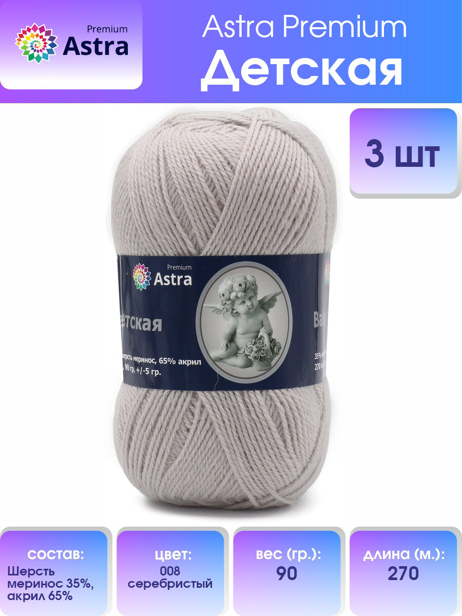 Пряжа для вязания Astra Premium 'Детская', 90г, 270м (35% шерсть меринос, 65% акрил) (008 серебристый), 3 мотка информация: