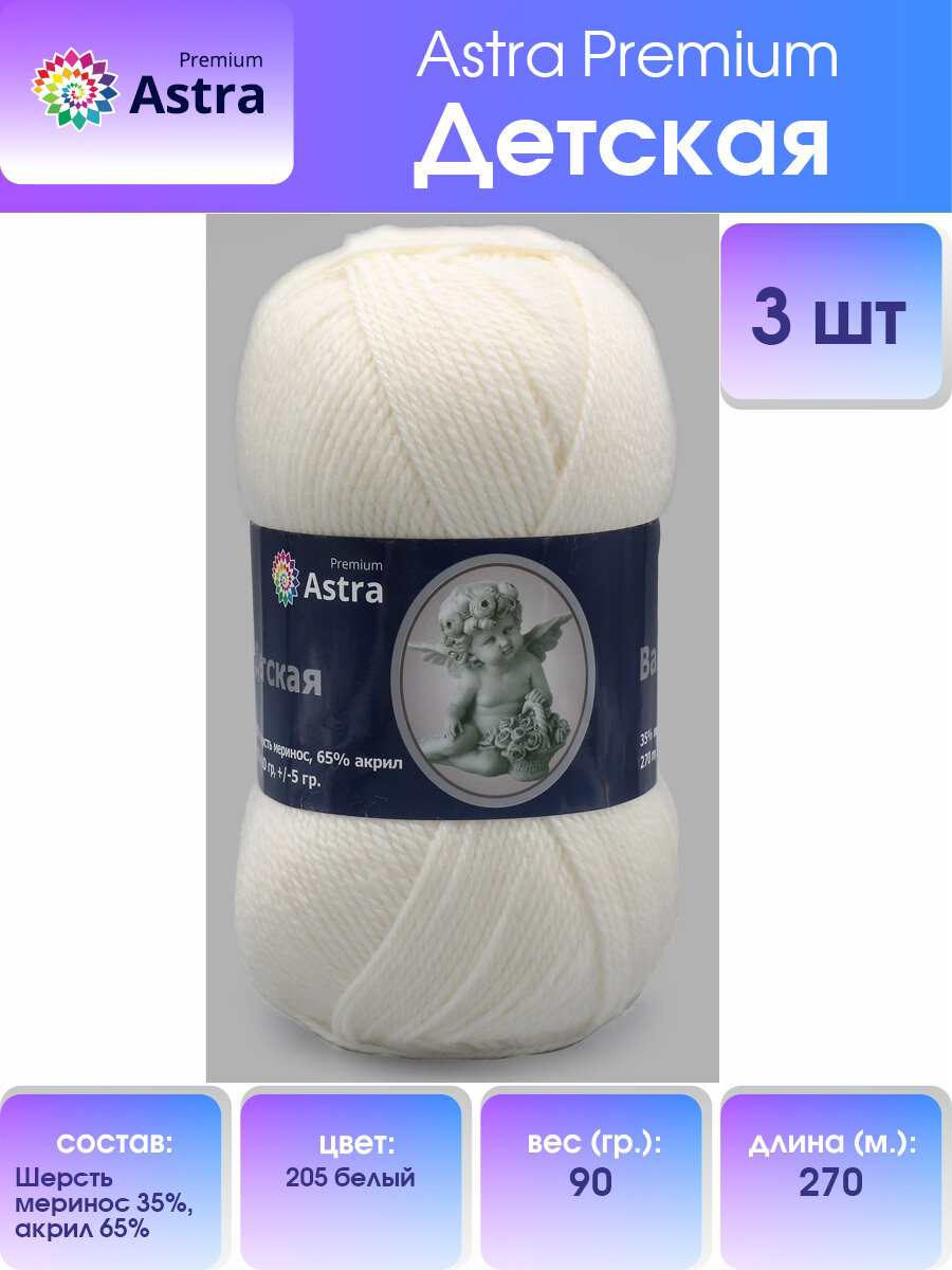 Пряжа для вязания Astra Premium 'Детская', 90г, 270м (35% шерсть меринос, 65% акрил) (205 белый), 3 мотка информация: