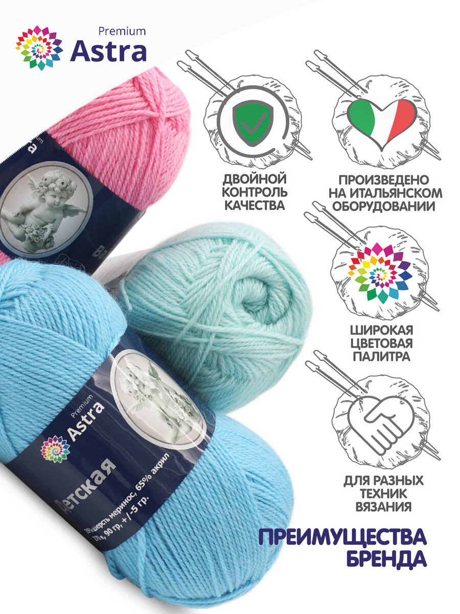 Пряжа для вязания Astra Premium 'Детская', 90г, 270м (35% шерсть меринос, 65% акрил) (023 светлая бирюза), 3 мотка 770 ₽