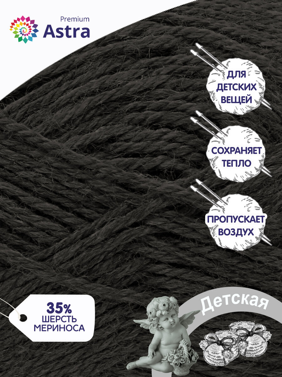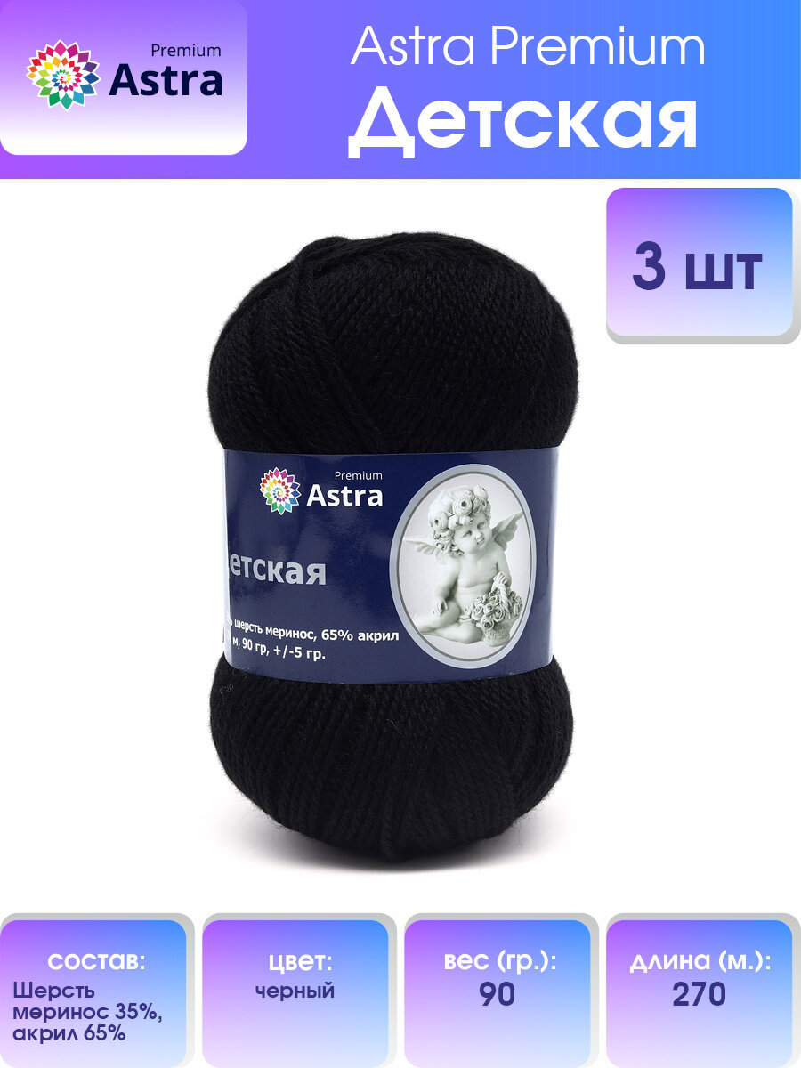 Пряжа для вязания Astra Premium 'Детская', 90г, 270м (35% шерсть меринос, 65% акрил) (черный), 3 мотка информация: