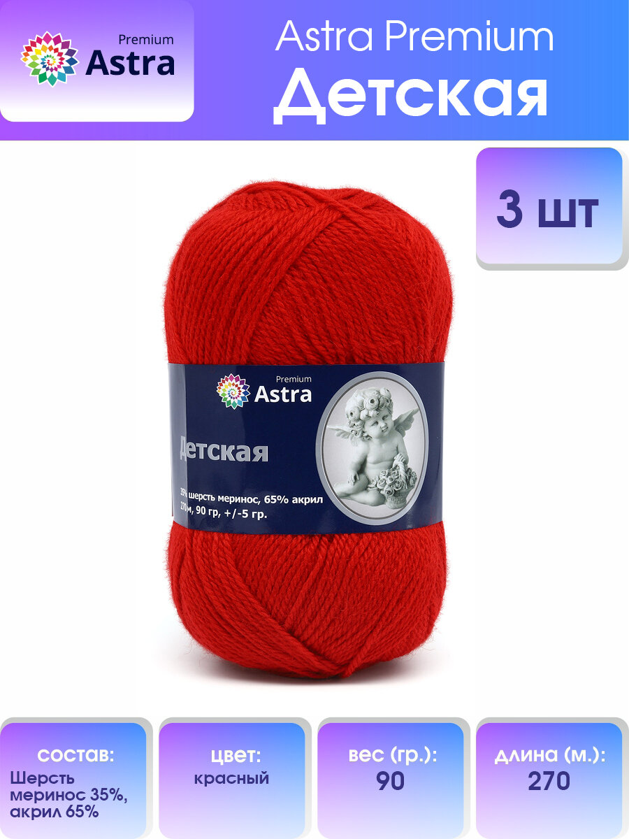 Пряжа для вязания Astra Premium 'Детская', 90г, 270м (35% шерсть меринос, 65% акрил) (красный), 3 мотка информация: