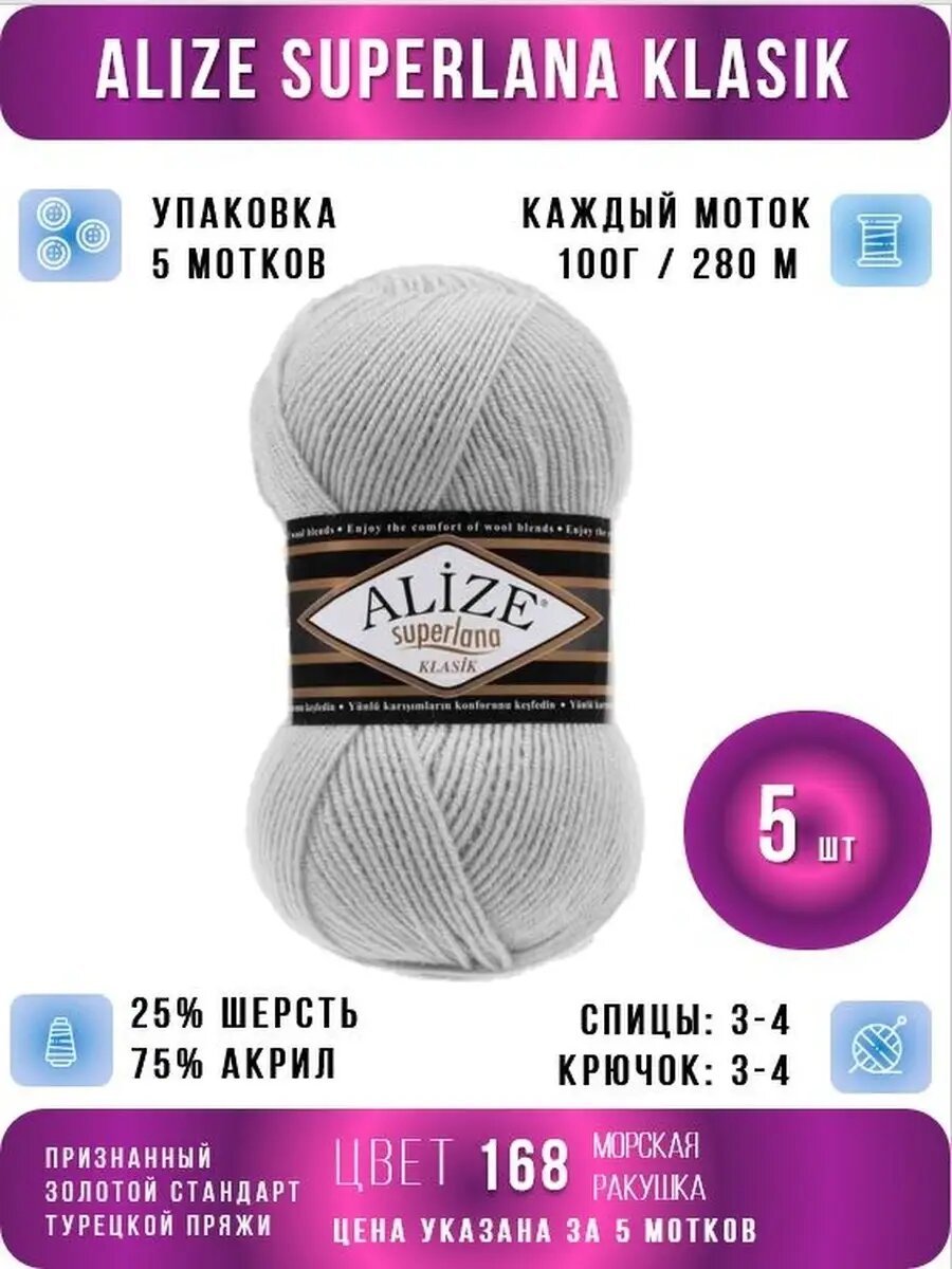 Отзывы на Пряжа Alize Superlana klasik светло-серый серебристый (168), 25%шерсть/75%акрил, 280м, 100г, 5шт