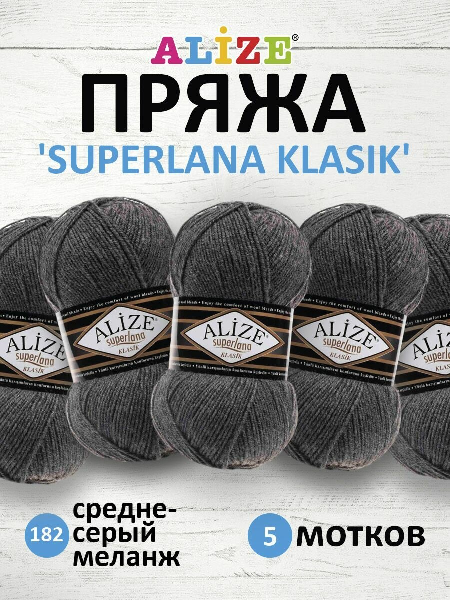 10 цен на Пряжа для вязания ALIZE 'Superlana klasik' (однотонная), 100г, 280м (75% акрил, 25% шерсть), ТУ (182 средне-серый меланж), 5 мотков