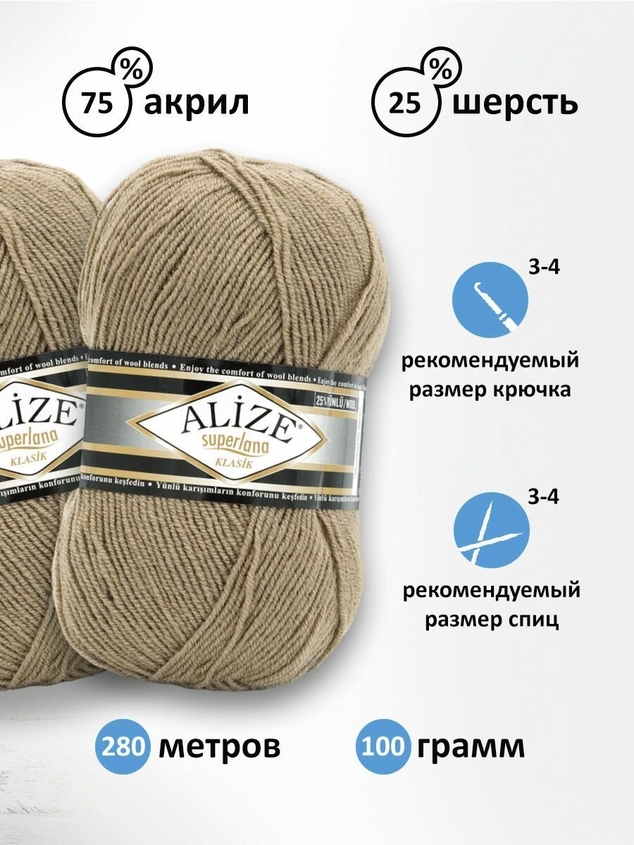 10 цен на Пряжа для вязания ALIZE 'Superlana klasik' (однотонная), 100г, 280м (75% акрил, 25% шерсть), ТУ (584 кофе с молоком), 5 мотков