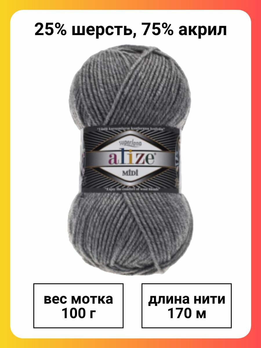 Пряжа Alize Superlana Midi 21 серый, 100 г, 170 м, 5 штук информация: