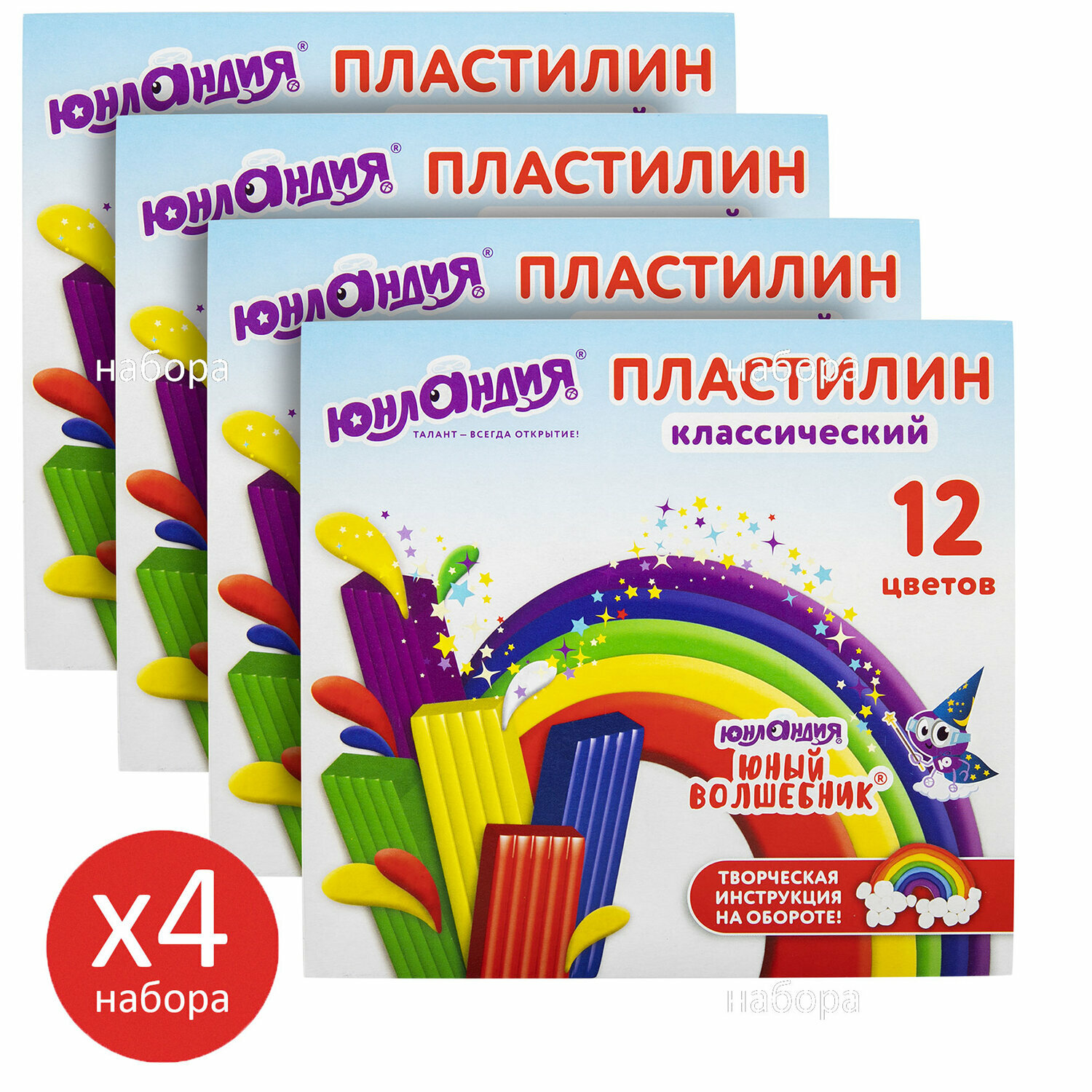Пластилин для лепки детский набор 4 штуки по 12 цветов большой, мягкий для малышей, классический в школу, 960 грамм, 4 стека, Юнландия, 881057 информация: