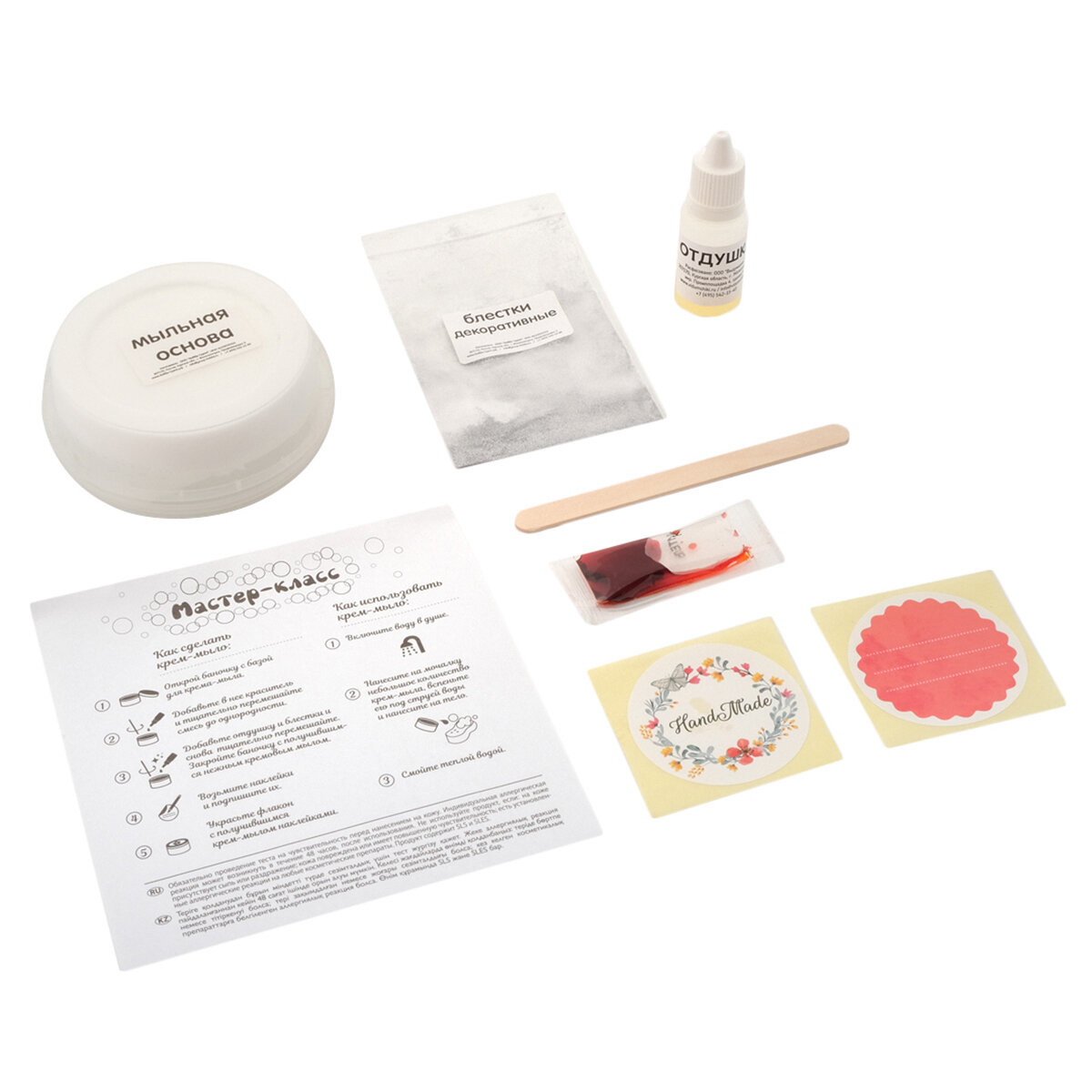 | Комплектация | основа для изготовления мыла Activ KREM, наклейки 2 шт., ароматизатор-отдушка, краситель, блестки, подробная инструкция на русском языке |