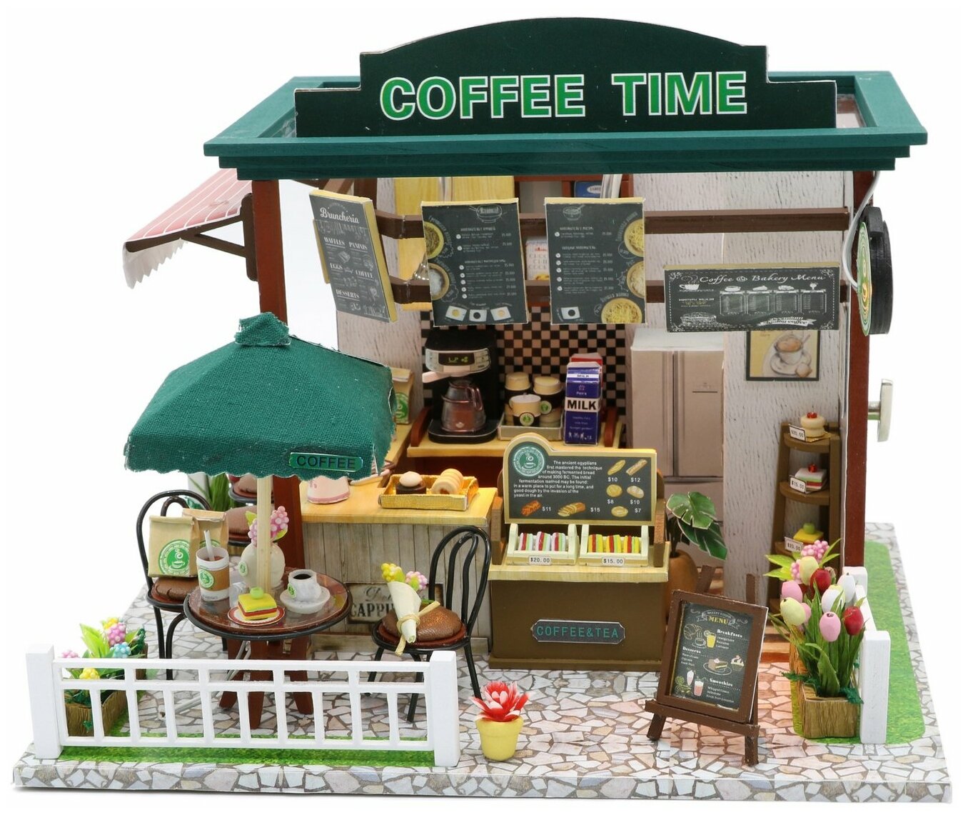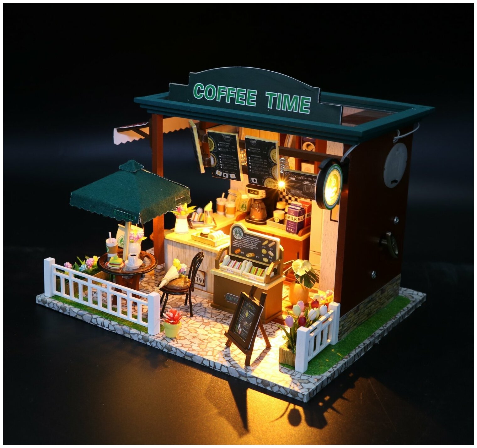 10 цен на Миниатюрная сборная модель (румбокс) "Кофейня Coffee Time" с куполом и подсветкой