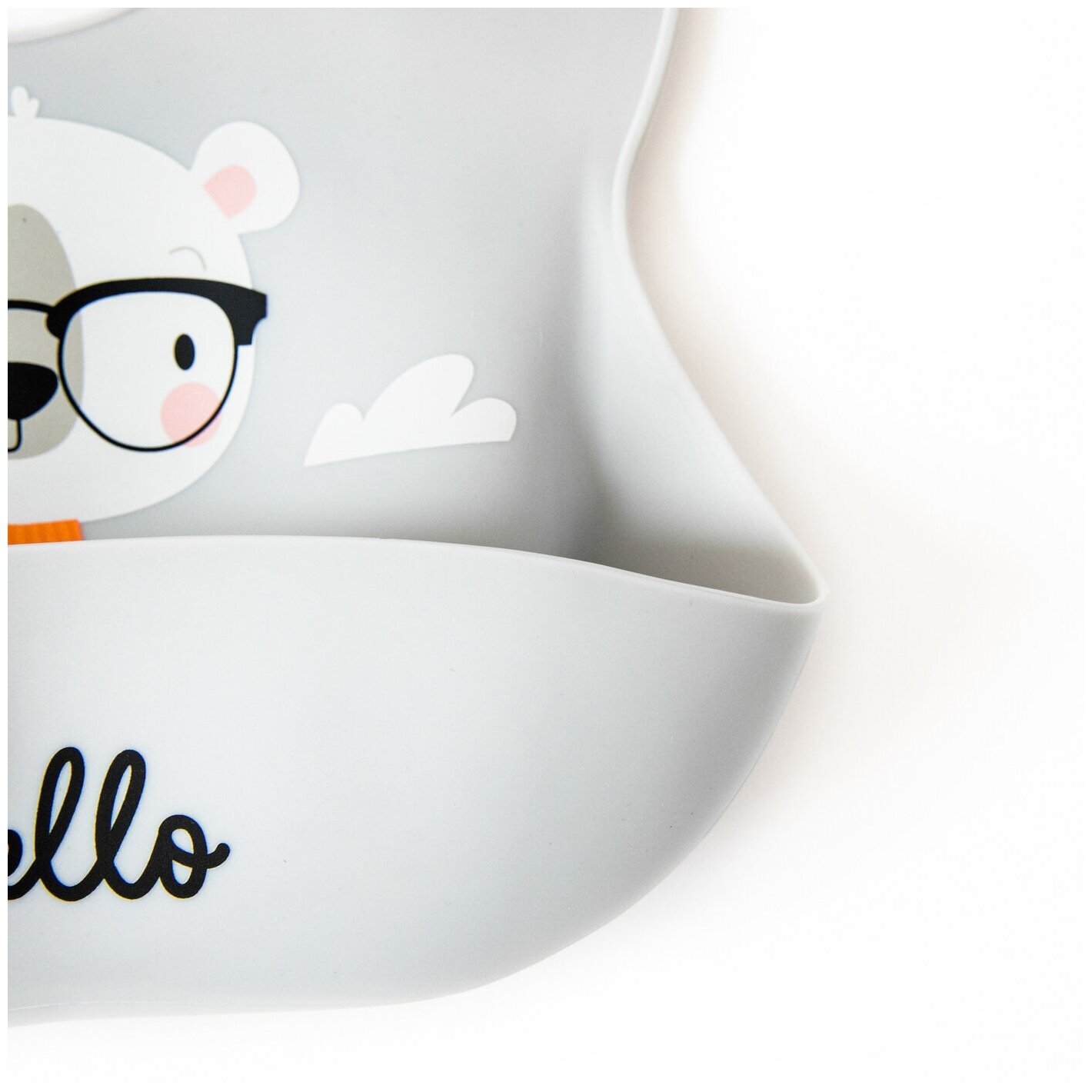Нагрудник для кормления детский силиконовый с кармашком, Tessolo Home, 21х28, "Пингвиненок", серый