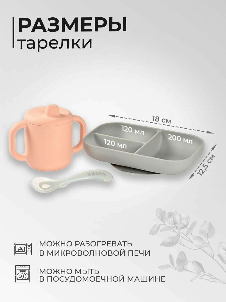 Набор силиконовой детской посуды BEABA: секционная тарелка на присоске, силиконовая кружка с ручками, ложка детская для кормления и прикорма информация:
