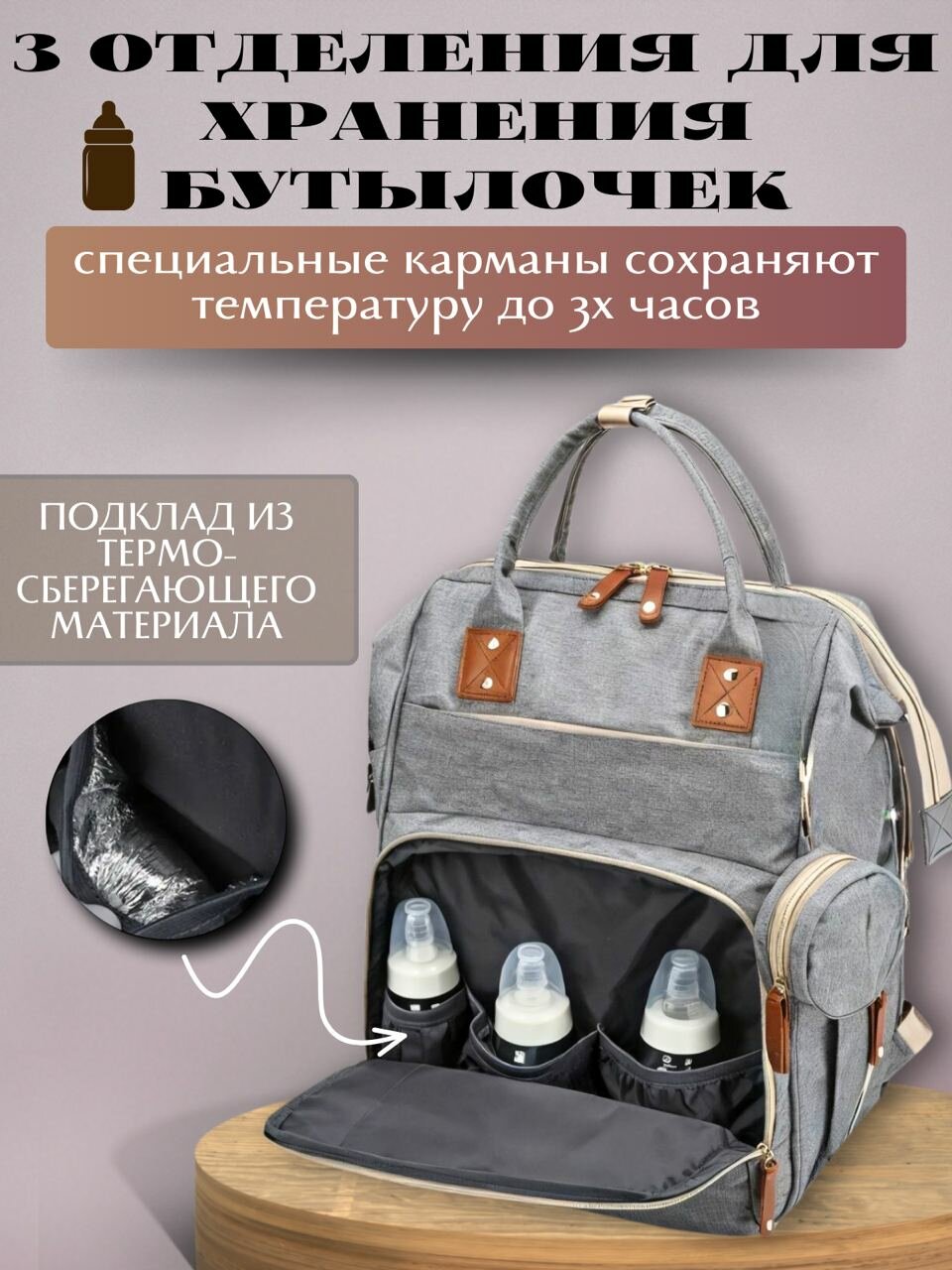 Отзывы на Многофункциональный рюкзак для мамы / Водонепроницаемый дорожный ранец + сумочка для мелочей Morento светло-серый
