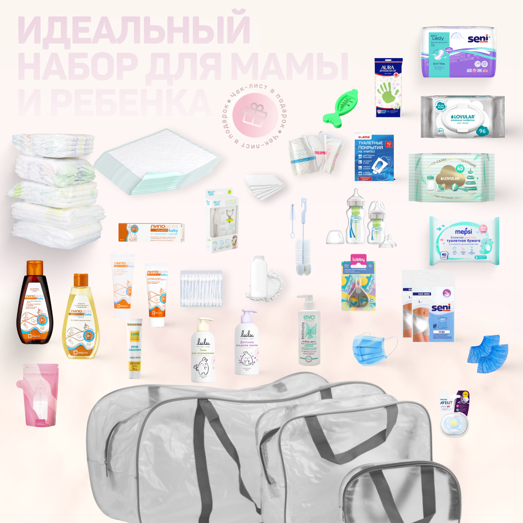 Сумка в роддом готовая для мамы и малыша с наполнением, 43 предмета + 3 сумки, комплектация "Супер Мама", прозрачная 19 720 ₽